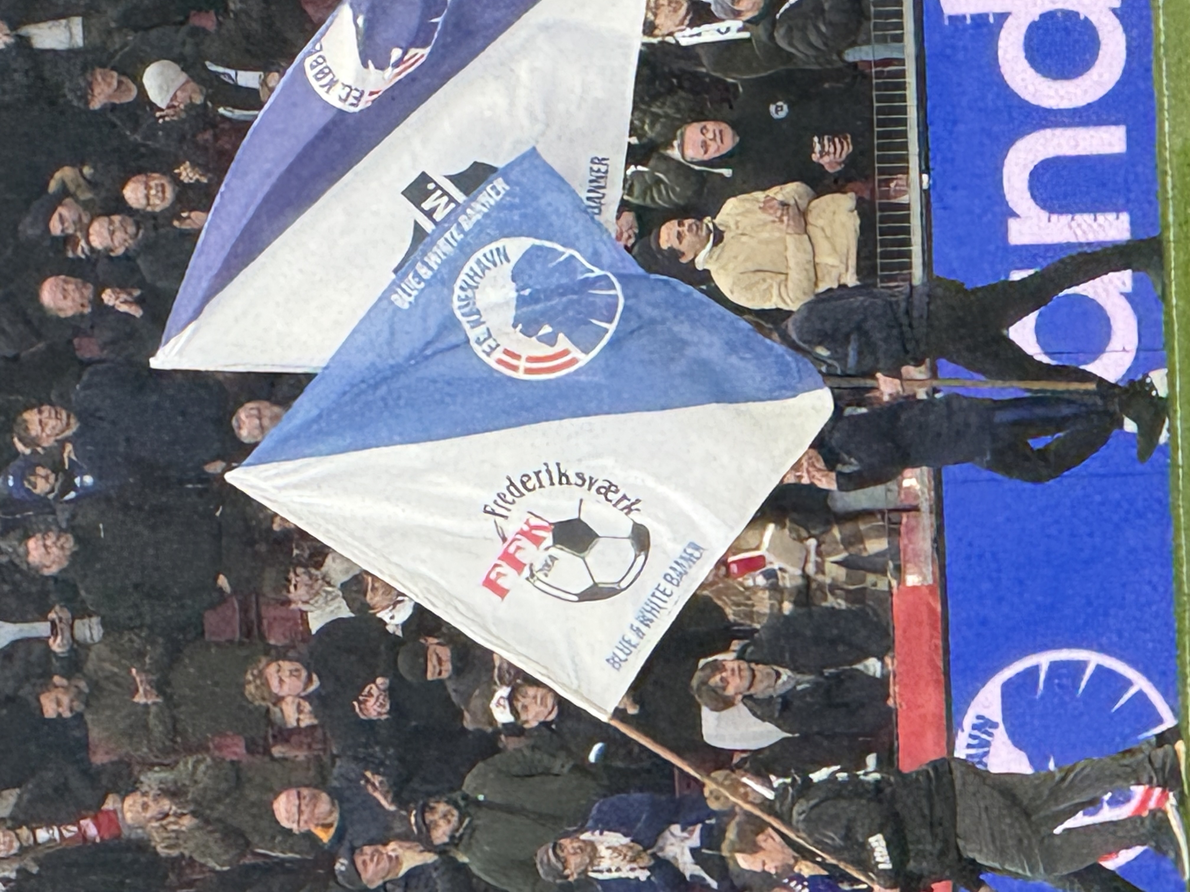 Dejligt at så mange havde taget vejen ind til fodbold, og på banen havde Anders og Hjalte turen rundt med fanen, hvor FFK logoet vises godt frem.